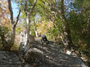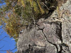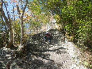 そこで、私が岩の上に回り込んでトップロープ用の支点を作り、